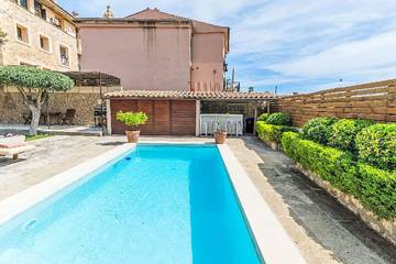 Udsigten fra ejendommen er fantastisk. Du kan beundre landsbyens centrum fra poolen såvel som de grønne marker, bjergene og endda havet. Forestil dig dine hviledage, hvor du svømmer alene eller soler dig på en af de 5 liggestole, omgivet af den beskyttede Tramuntana-bjergkæde. Klorpoolen er 4 x 4 meter og har en vanddybde på 1,5 meter. Den er placeret midt på den vidunderlige terrasse med flere niveauer, hvilket gør den til noget helt særligt. Foran poolen er der en fantastisk terrasse med bord og stole, hvor man kan nyde sin middag i det fri under stjernehimlen, kun ledsaget af lysene fra landsbyen - en uforglemmelig oplevelse! Huset er fordelt på to smagfuldt indrettede etager. Entréen fører til spisestuen og køkkenet. Den første har en mallorcinsk stil, der kan mærkes på naturstensvæggene og de rustikke møbler, som omfatter et stort bord med designerstole, hvor man kan sidde og spise sammen. Efter tre trin og en stor buegang kommer vi ind i køkkenet, der er udstyret med rustikke møbler, induktion, ovn, mikroovn og alt, hvad du skal bruge for at lave mad som derhjemme. På denne etage er der et soveværelse med dobbeltseng og klædeskab samt et separat badeværelse med bruser. Når vi går ovenpå, kommer vi til en smuk stue, hvor du kan se satellit-tv i sofaerne, lytte til musik på cd-afspilleren eller læse en bog i gyngestolen, ledsaget af landskabet og airconditionen. Her har vi ...